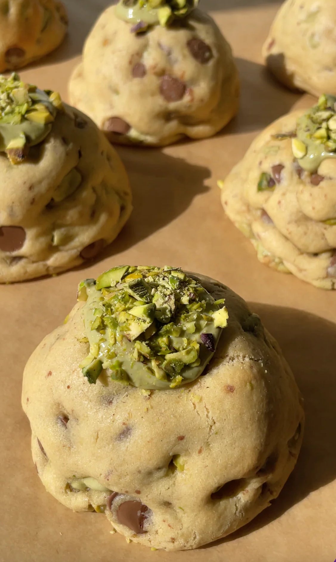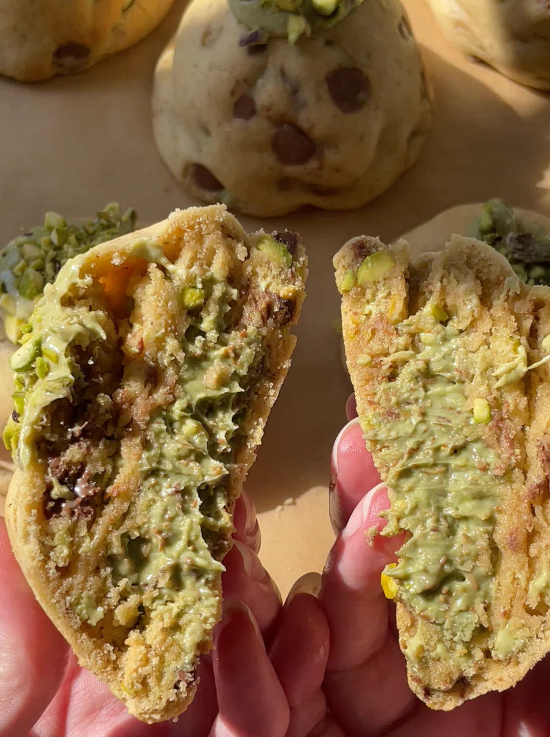 Our Dubai Chocolate NYC Chunks & Cream Cookies are loaded with sweet, gooey flavour in every bite. Each cookie features a pistachio swirl and chopped pistachio pieces displayed on top of the soft , slightly chewy cookie, filled will delicious crushed pistachio pieces, White chocolate chunks and Milk chocolate chips. To make them even more indulgent, we’ve added a creamy but crunchy ball of Dubai Chocolate Kanufa filling accompanied , creating a soft, gooey middle with a perfect cookie crunch. Sweet, rich, and impossible to resist.